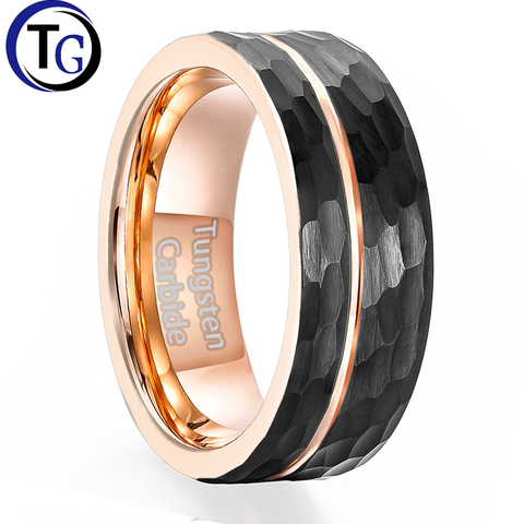 Anillo de boda de carburo de tungsteno de 8mm martillado chapado en oro rosa negro TG para hombres con acabado cepillado